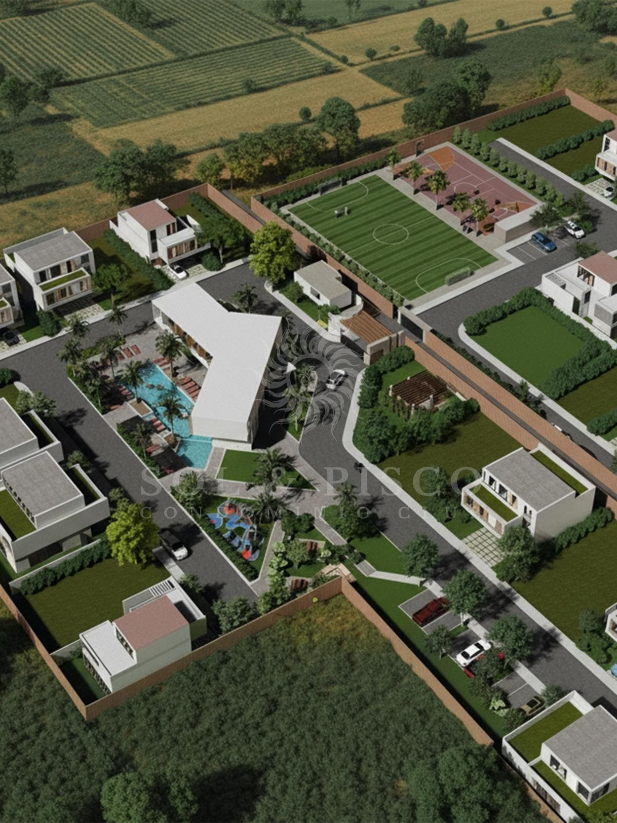 El condominio tiene el formato de club privado para sus residentes, contará con Club House, piscina para niños y adultos, juegos para niños, cancha de futbol de césped sintético, losa deportiva multiusos, zonas de ocio, zona de parrillas, zona de fogatas, gimnasio, restaurante, marquet local y muchas áreas verdes.